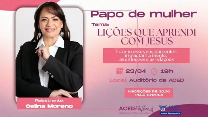 A ACED (Associação Comercial e Empresarial de Dourados), por meio do Conselho ACED Mulher, realiza no dia 23 de abril, às 19h, mais uma edição do Papo de Mulher, com a palestra “Lições que aprendi com Jesus”, ministrada pela especialista em desenvolvimento humano Celina Moreno. O evento propõe uma noite de reflexão sobre como ensinamentos cristãos podem impactar positivamente a mente, as emoções e os relacionamentos.