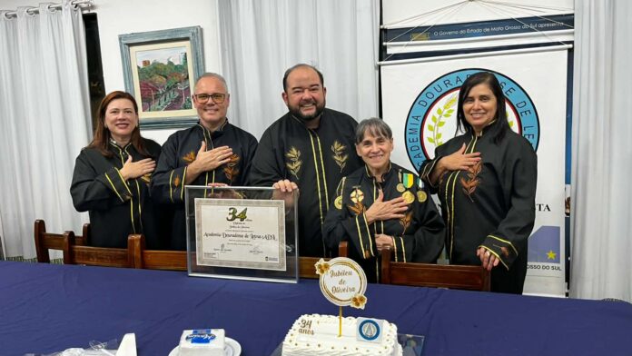 E, com distinção e muito orgulho a ADL recebe o Jubileu de Oliveira comemorando os 34 anos de Fundação da Academia Douradense de Letras, proposição do Excelentíssimo Vereador e Confrade Marcelo Mourão.