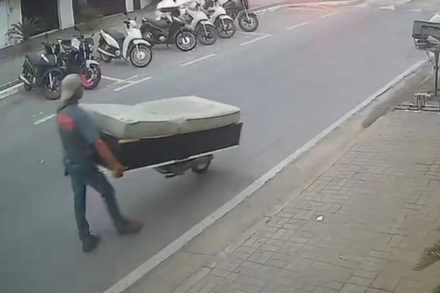 Imagens, as quais o Metrópoles teve acesso com antecedência, mostrou o passo a passo de um dos suspeitos. Nas imagens, é possível ver o homem empurrando um carrinho com dificuldade por diversas ruas de Vicente de Carvalho, um dos bairros mais populosos e movimentados do litoral sul de São Paulo. Dentro da cama box estava o corpo da aposentada.