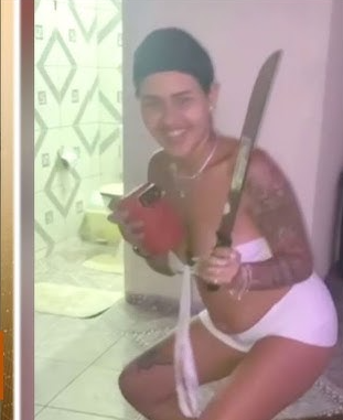 A suspeita faz graça na rede social, sempre armada com um facão. As duas tiveram uma briga séria nas redes sociais por conta de ciúmes.