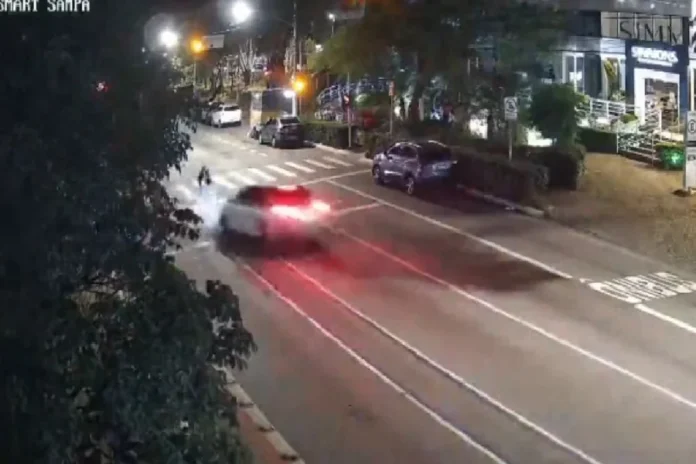 Uma outra câmera mais à frente na avenida também mostrou o carro deixando o local, ainda em alta velocidade, comprovando que ele não prestou socorro à vítima após o acidente.