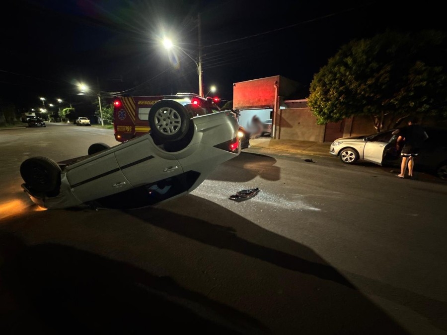 A batida aconteceu no cruzamento da Rua Arceu Tolfo com as ruas Luiz Rodrigues Ferreira e Osmar de Moraes. Conforme informações apuradas no local, um veículo Ford, conduzido por um jovem, colidiu contra dois carros que estavam estacionados — uma Fiat Strada e um Chevrolet Ônix — e, com a força do impacto, acabou capotando na via.