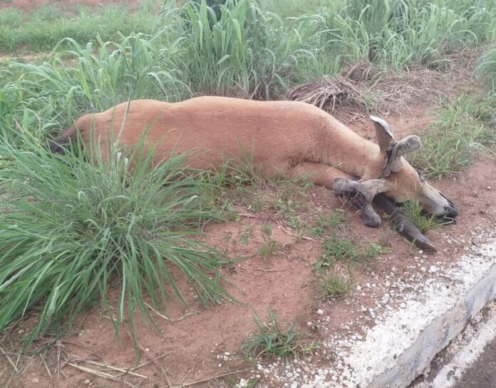 Um cervo típico da região do Cerrado foi atropelado e morreu na BR-060, nas proximidades da Fazenda Tonito, em Chapadão do Sul, município localizado no nordeste de Mato Grosso do Sul. O caso foi registrado por um produtor rural que trafegava pela rodovia no momento do flagrante.