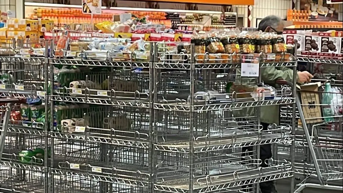 Em outras imagens, moradores da cidade aparecem lotando os corredores de supermercados e abastecendo os carrinhos com mantimentos. As prateleiras com alguns tipos de alimentos estão totalmente vazias. Grandes filas se formam entre os corredores e caixas.