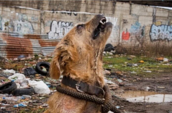 Um cachorro completamente coberto de lama, o corpo magro demais para esconder as costelas salientes, os olhos cansados apontando para o alto… como se ainda acreditasse que alguém voltaria para buscá-lo. Preso a uma corrente grossa, ele havia passado dias — talvez semanas — exposto à chuva, ao frio e à solidão. Sem comida. Sem água. Sem qualquer gesto de carinho. Ainda assim, o coração continuava firme, resistindo.