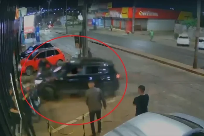 Só que o dono do carro preto retorna ao veículo, descontrolado, e realiza uma manobra avançando contra o grupo que está na calçada, chegando a atingir duas motos que estavam estacionadas e a “arrastar” um homem.