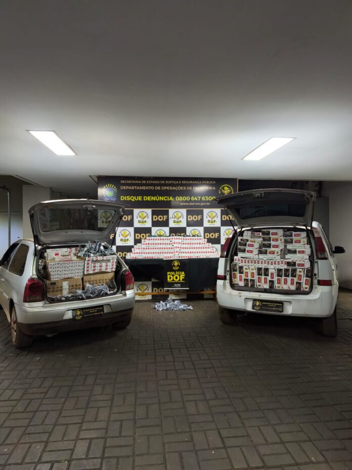 Policiais militares do DOF (Departamento de Operações de Fronteira) apreenderam, na noite de segunda-feira (26), dois veículos carregados com 3 mil pacotes de cigarros contrabandeados do Paraguai e fardos de produtos de descaminho. A ação ocorreu em uma casa no perímetro urbano de Dourados.