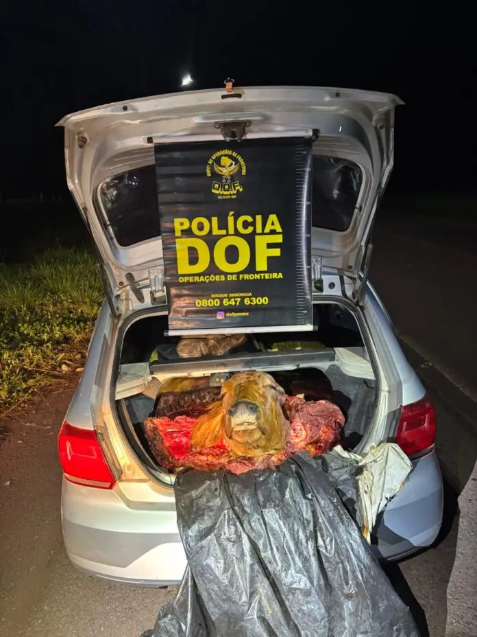 A equipe realizava bloqueio quando abordou um veículo VW Gol. Durante a vistoria, os militares encontraram uma grande quantidade de carne bovina espalhada sobre os bancos e no porta-malas do carro. Questionados sobre a origem do produto, os ocupantes apresentaram informações contraditórias e não possuíam nota fiscal ou qualquer comprovante de procedência legal.