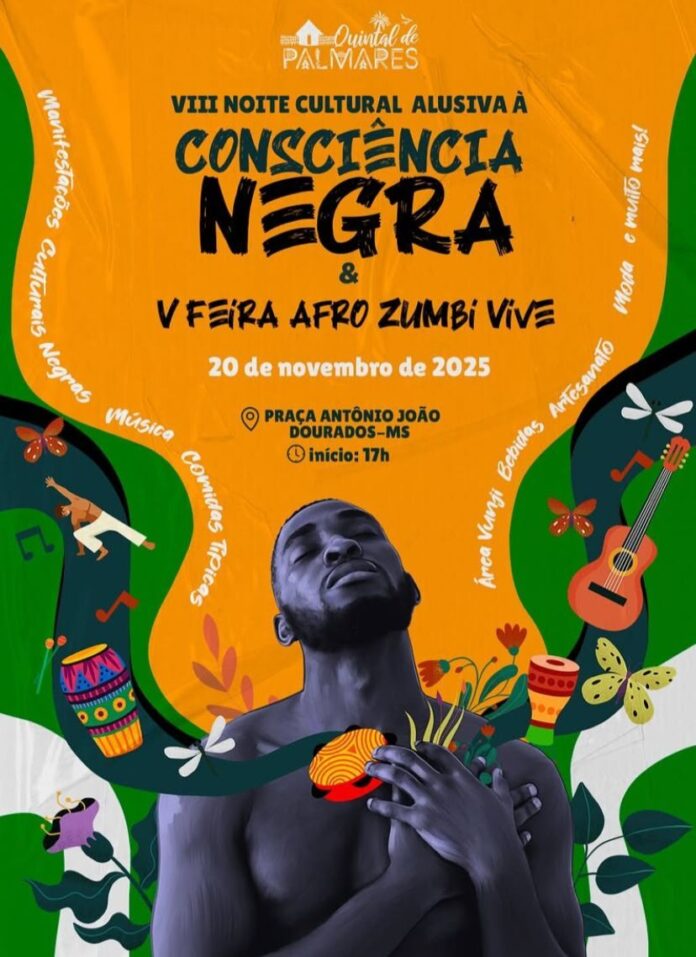 Dourados recebe, nesta quinta-feira (20), a 5ª Feira Afro Zumbi Vive e a 8ª Noite Cultural da Consciência Negra, a partir das 17h, na Praça Antônio João. Organizado pelo Coletivo Negro Quintal de Palmares em parceria com o Conselho Municipal de Defesa e Desenvolvimento dos Direitos Afro-Brasileiros (Comafro), o evento reúne apresentações culturais e religiosas, gastronomia, artesanato, moda, música e empreendedorismo negro.