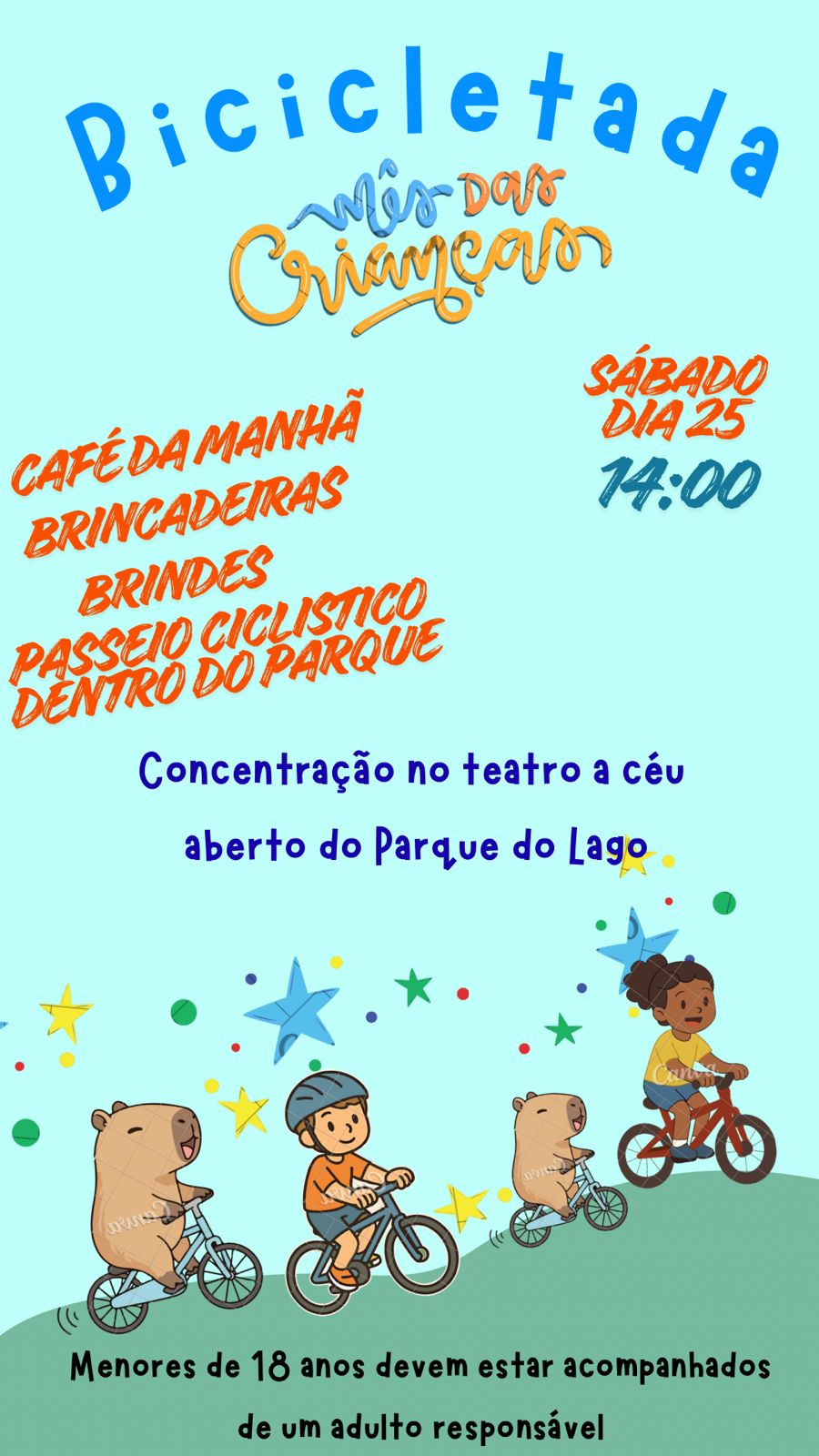 Neste sábado, dia 25 de outubro, o Parque do Lago será um espaço de brincadeiras e movimento, com a Bicicletada do Mês das Crianças. O evento, gratuito e aberto ao público de todas as idades, promete uma tarde de atividades lúdicas, conversa, convivência e pedalada em família.