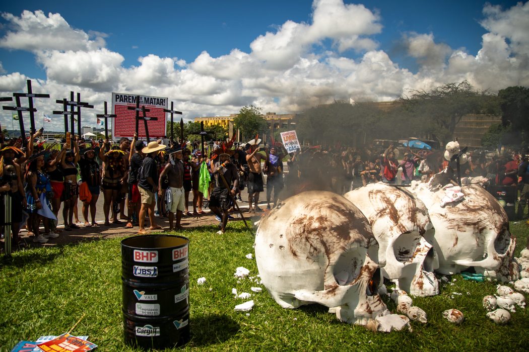 O tema foi denunciado por Auricélia Arapiun, liderança da região Baixo Tapajós (PA), durante a marcha.; “O Congresso tem insistido em liberar a mineração nos nossos territórios, e nós estamos levando caveiras e realizando esta manifestação pela garantia dos direitos dos povos indígenas. Também dizemos: fora Congresso Nacional, fora Belo Sun, fora Cargill, fora todos os empreendimentos que afetam nossas vidas”, listou.