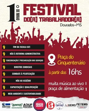 Em celebração ao Dia do Trabalhado, será realizado no próximo 1º de maio, a partir das 16h, o Festival do(a) Trabalhador(a), na Praça do Cinquentenário, em Dourados. O evento é uma iniciativa do Comitê de Defesa Popular de Dourados-MS, composto por entidades sindicais e organizações representativas dos trabalhadores do município.