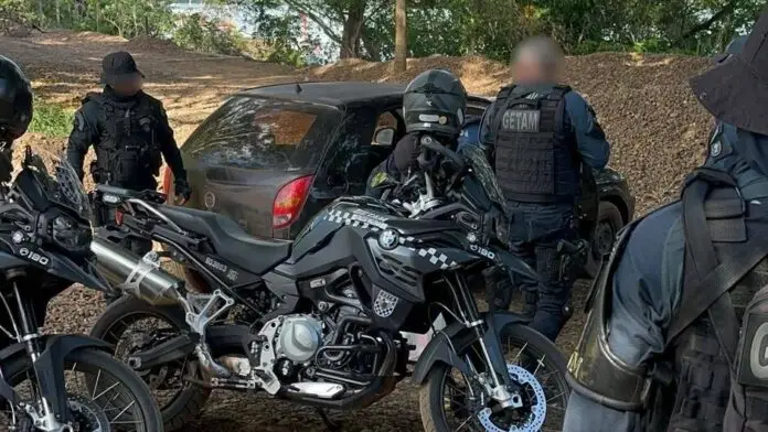 Durante as diligências, os policiais localizaram o veículo escondido entre árvores, próximo à margem do Rio Paraná. No momento das buscas, a equipe ouviu passos e avistou um homem com as características repassadas correndo em direção ao rio. Os militares ordenaram que ele se rendesse, porém o suspeito entrou na água e passou a nadar, indicando tentativa de fuga.