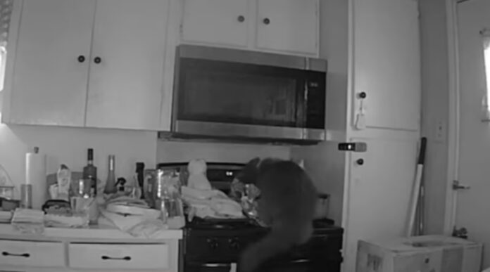 Imagens da câmera de segurança mostram o momento em que o gato pula no fogão. Ele acaba apertando o botão de ligar sem querer e, assim que percebe as chamas, pula e foge do local.
