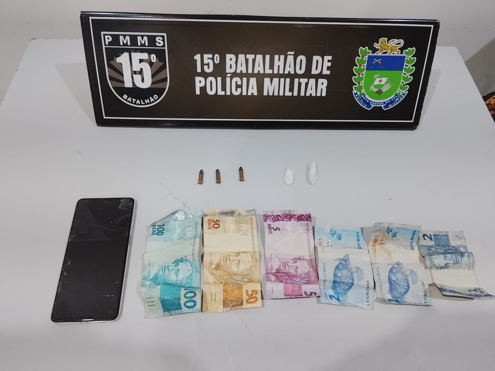 Durante a busca pessoal, foram encontradas no bolso da calça jeans três munições intactas calibre .22, dois papelotes de substância análoga à cocaína, pesando aproximadamente um grama, além de R$ 161,00 em dinheiro.