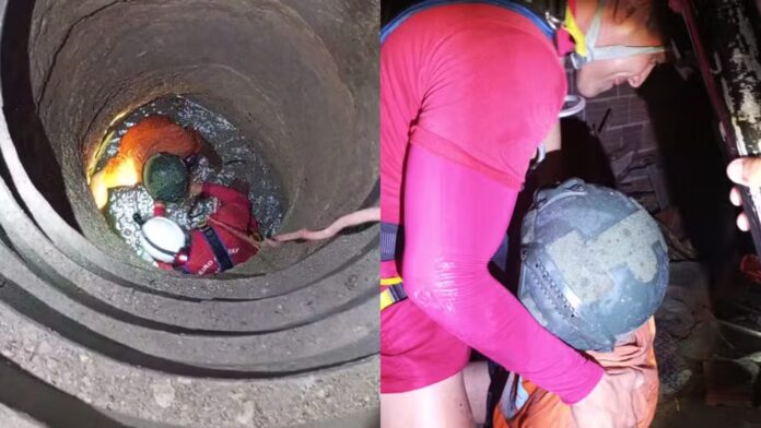 Então, um agente desceu até o interior do poço para prestar os primeiros atendimentos. Segundo a equipe, a vítima estava consciente e orientada, mas apresentava suspeita de fratura no braço esquerdo e no tornozelo direito, além de escoriações nos dois joelhos, possível lesão na região lombar e sinais de hipotermia.