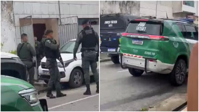 Imagens registradas por testemunhas mostram o momento em que viaturas da Força Tática e do policiamento ostensivo chegam à casa da vítima. Na sequência, os agentes entram no local armados para impedir a ação do homem.