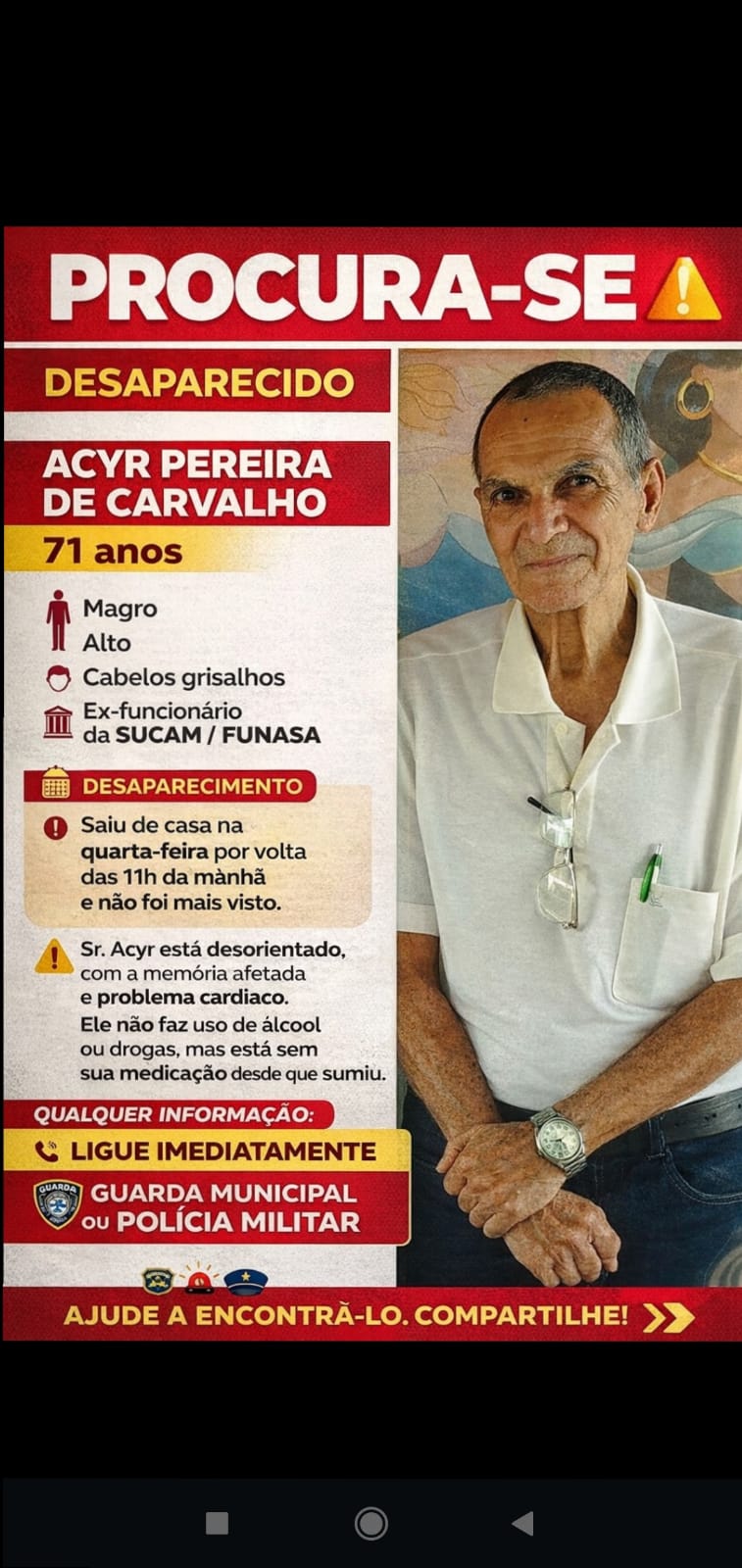 A família pede a colaboração da população. Qualquer informação que possa ajudar a localizar o idoso deve ser comunicada imediatamente às autoridades, pelos telefones 190 (Polícia Militar) ou 199 (Guarda Municipal).