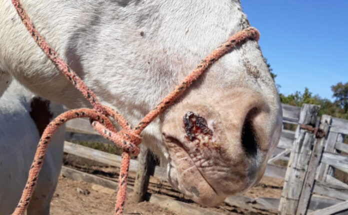 A doença se manifesta na forma nasal apresentando nódulos e úlceras que podem se unificar abrangendo grandes áreas.