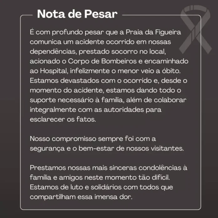 Na manhã desta quarta-feira (01), o Balneário Praia da Figueira, de Bonito, emitiu nota de pesar sobre a morte ocorrida ontem (31), de criança que brincava próximo a um tobogã.