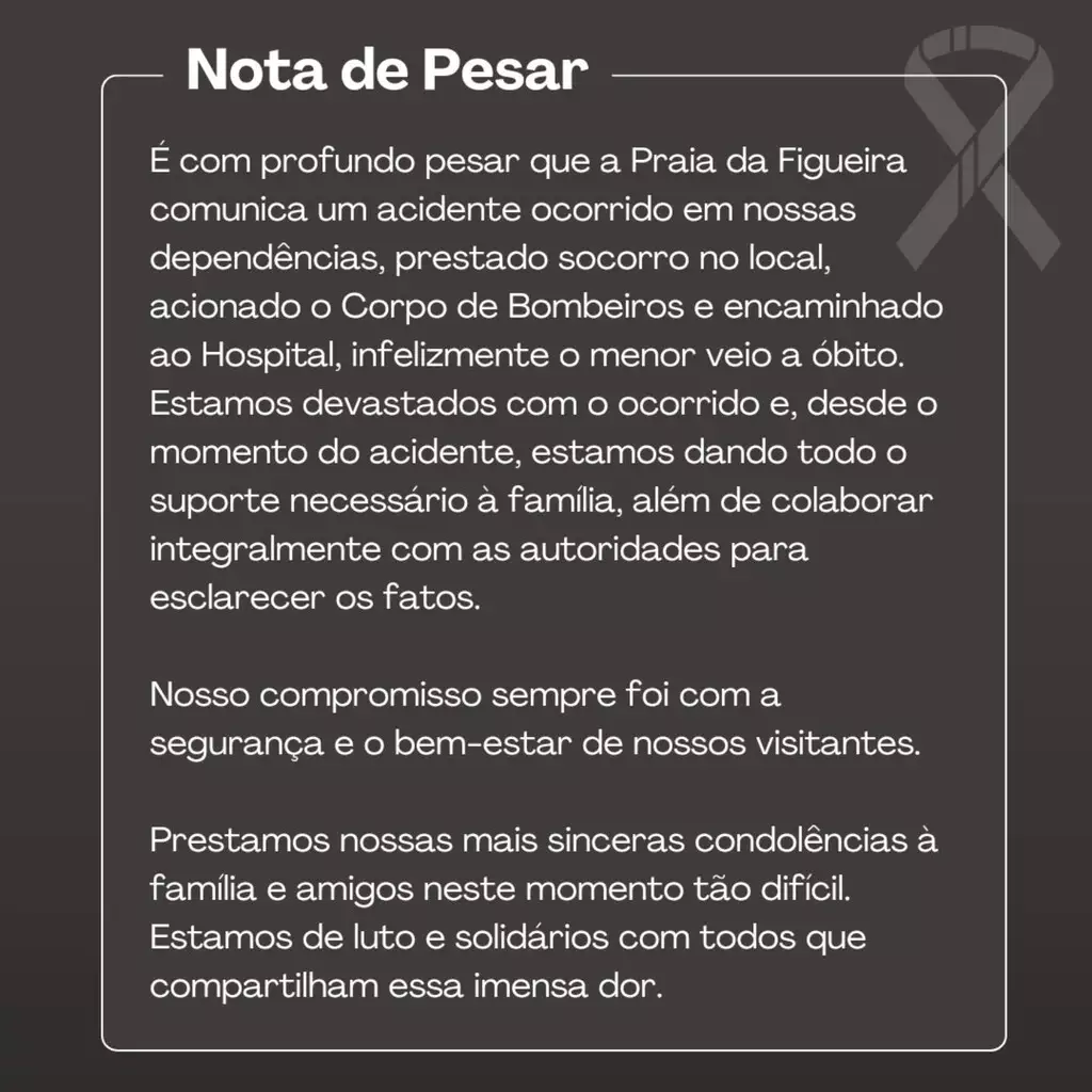 Através de redes sociais, a direção do balneário disse que prestou socorro ainda no local e acionou o Corpo de Bombeiros, que encaminhou a criança para um hospital da região, onde a morte foi confirmada.