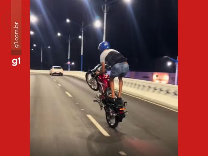 No vídeo, que viralizou nas redes sociais, o motociclista se exibe enquanto comete uma série de infrações de trânsito com a moto sem placas, em alta velocidade, invade as faixas ignorando a sinalização e ‘dá o grau’. O homem chega a ficar em pé em cima da moto.