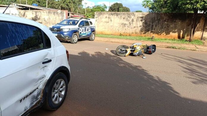 Uma motociclista de aproximadamente 50 anos ficou ferida após um acidente envolvendo uma moto e um carro na tarde deste sábado (18), na Rua Santa Quitéria, próximo à Rua da Divisão, no bairro Vila Nogueira, em Campo Grande.