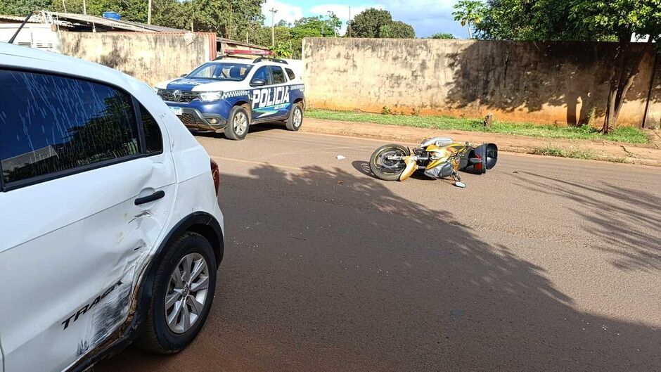 O carro teve danos consideráveis na lateral traseira esquerda, enquanto a motocicleta ficou caída na via.