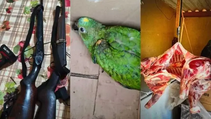 Durante a vistoria, os agentes também encontraram animais silvestres mantidos em cativeiro, entre eles um papagaio. Diante da constatação de crime ambiental, a Polícia Militar Ambiental (PMA) foi acionada para fazer o resgate dos animais e adotar os procedimentos administrativos cabíveis.