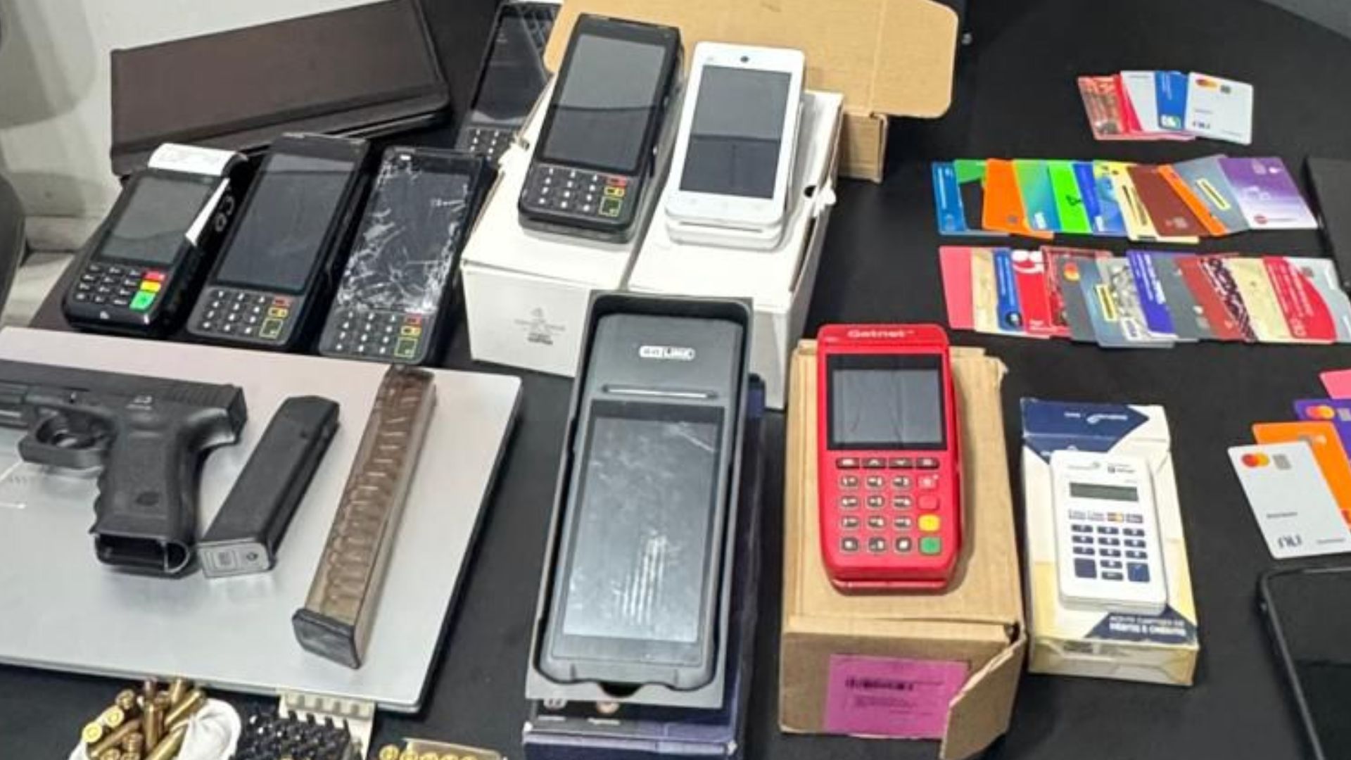 Também foram cumpridos 15 mandados de busca e apreensão. Entre os materiais apreendidos estão a arma de fogo, um carregador prolongado, cerca de 100 munições calibre 9 mm, oito máquinas de cartão, aproximadamente 40 cartões de crédito em nomes diversos, um veículo importado, além de celulares e computadores.