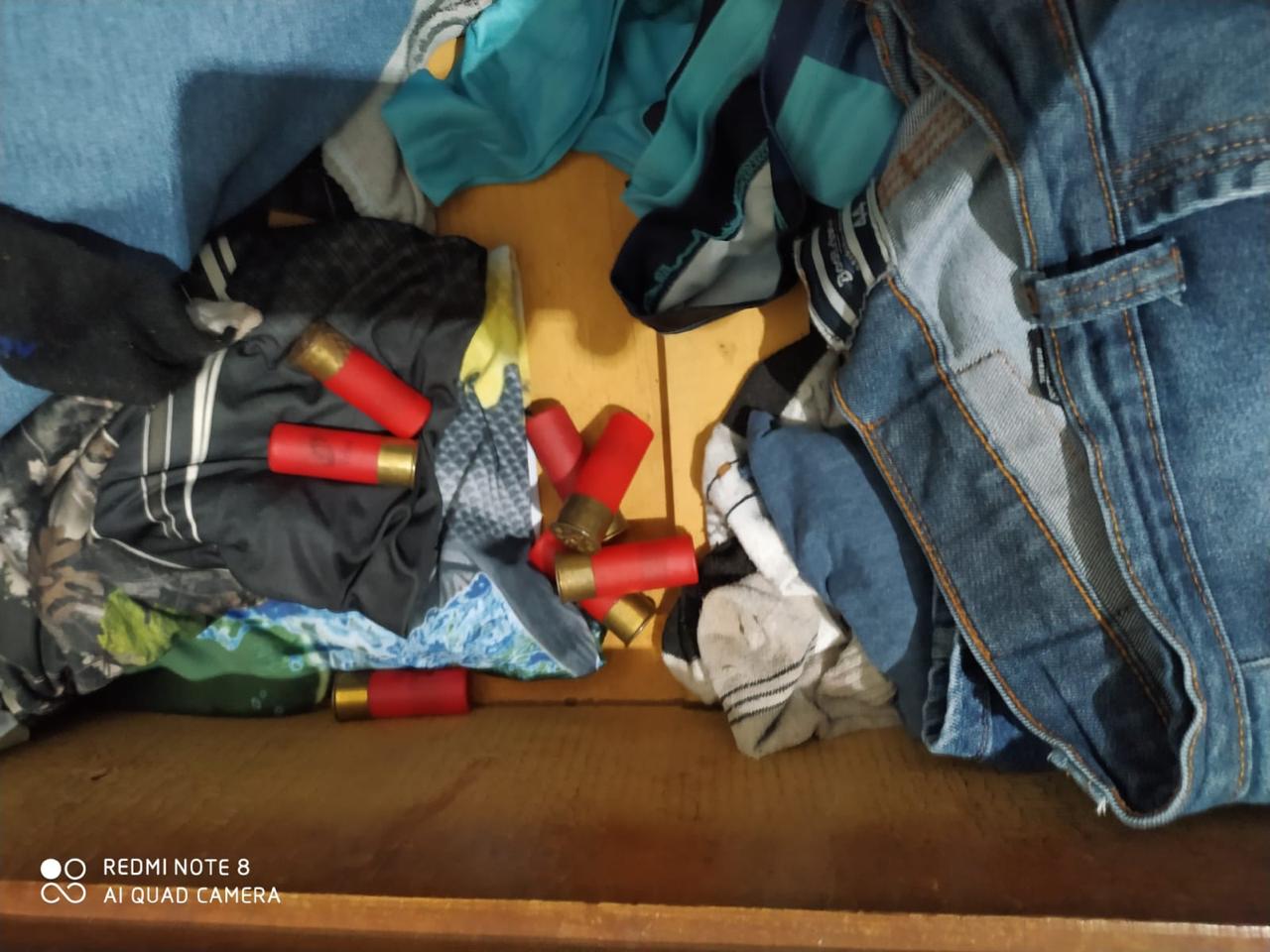 Durante as buscas, os policiais encontraram um revólver calibre .38, da marca Taurus, acompanhado de duas munições intactas. No local, também foram apreendidas sete munições calibre 12, todas sem registro de origem ou documentação legal.