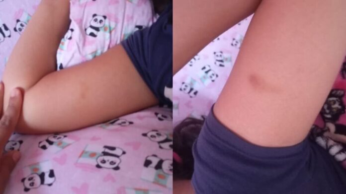 Porém, neste momento, ela teria sido agarrada pelo braço e apertada. No dia, a menina ficou com o braço apenas vermelho, mas, dias depois, a lesão começou a ficar roxa.