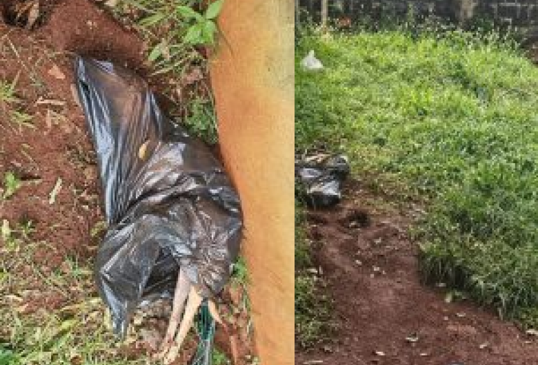 De acordo com as informações apuradas, a cadela, identificada como K., de aproximadamente um ano, foi encontrada morta dentro de um saco de lixo preto, no mesmo local onde, segundo as investigações, era mantida presa por uma coleira, sem abrigo adequado.