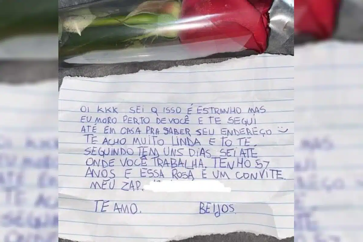 “Sei que isso é estranho, mas eu moro perto de você e te segui até em casa para saber seu endereço. Te acho muito linda e tô te seguindo tem uns dias, sei até onde você trabalha”, diz trecho do bilhete.