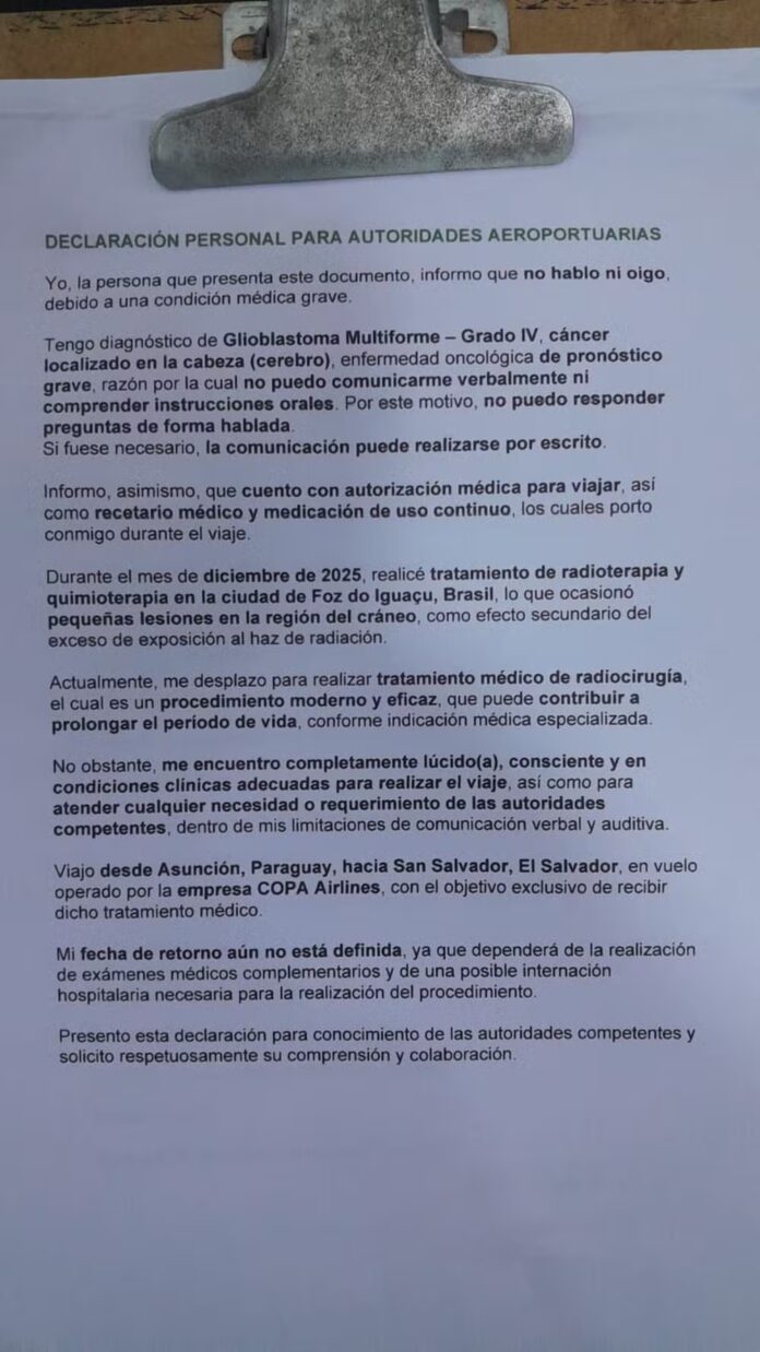 “Viajo desde Assunção, Paraguai, para San Salvador, El Salvador, em voo operado pela empresa COPA Airlines, com o objetivo exclusivo de receber referido tratamento médico.”