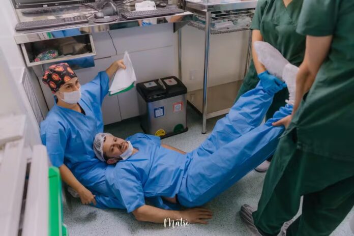 O vídeo foi gravado pelas fotógrafas que acompanhavam o parto e mostra o instante em que Maicon precisa ser amparado por uma das enfermeiras logo após o nascimento da bebê, enquanto parte da equipe reage de forma descontraída à situação.