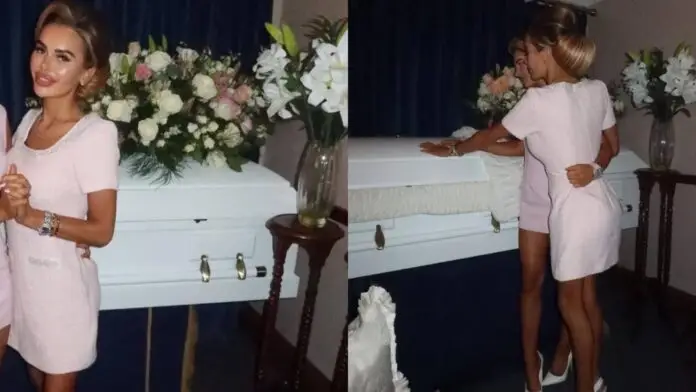 A influenciadora Sophie-May Dickson, de 32 anos, gerou polêmica ao compartilhar fotos ao lado do caixão da filha Princess Dickson, que cometeu suicídio em fevereiro, aos 16 anos, após sofrer bullying na escola. Em sua rede social, a britânica postou um ensaio, em que aparece com um vestidinho rosa, sapatos de salto alto, topete e maquiagem, ao lado da outra filha.