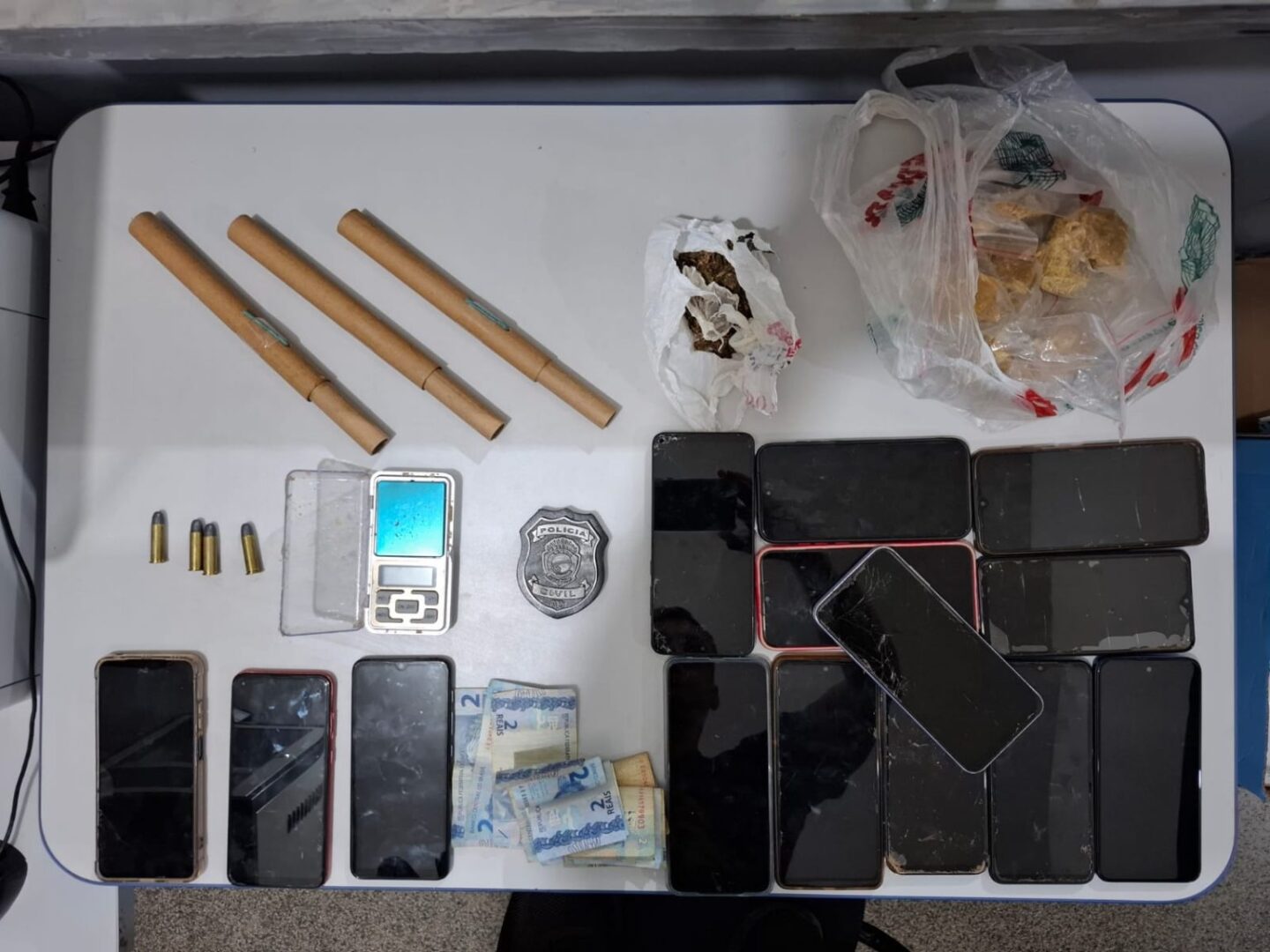 Foi realizada buscas no imóvel e apreendidos 9 celulares que eram recebidos como pagamento de drogas, por usuários. Além disso, foram apreendidas: balança de precisão, faca e munições, que estavam escondidas em um terreno próximo ao local dos fatos.