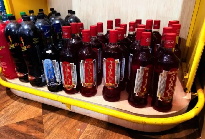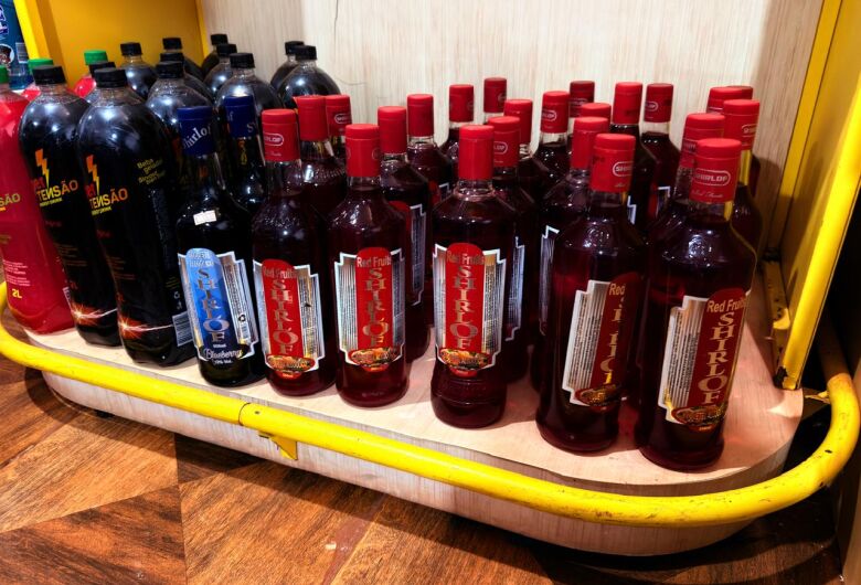 Foram encontradas 58 garrafas de coquetel alcoólico da marca Shirlof, a mesma produzida na fábrica clandestina, expostas para venda no local.