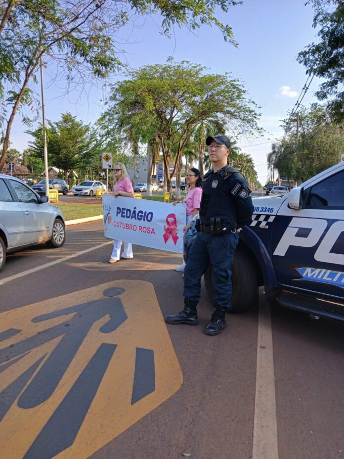 Na tarde de ontem (9), a Polícia Militar em Nova Alvorada do Sul participou de um pedágio solidário junto com a Rede Feminina de Combate ao Câncer, em alusão à campanha Outubro Rosa.