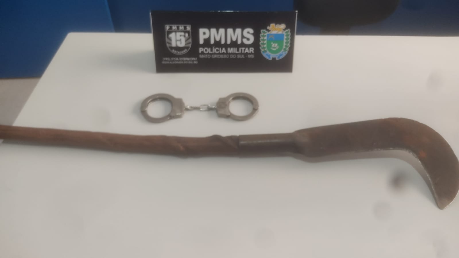 O foice utilizado nas ameaças foi apreendido. A vítima não apresentava lesões aparentes no momento da ocorrência. O uso de algemas foi necessário, pois o policial encontrava-se sem apoio no atendimento da ocorrência.
