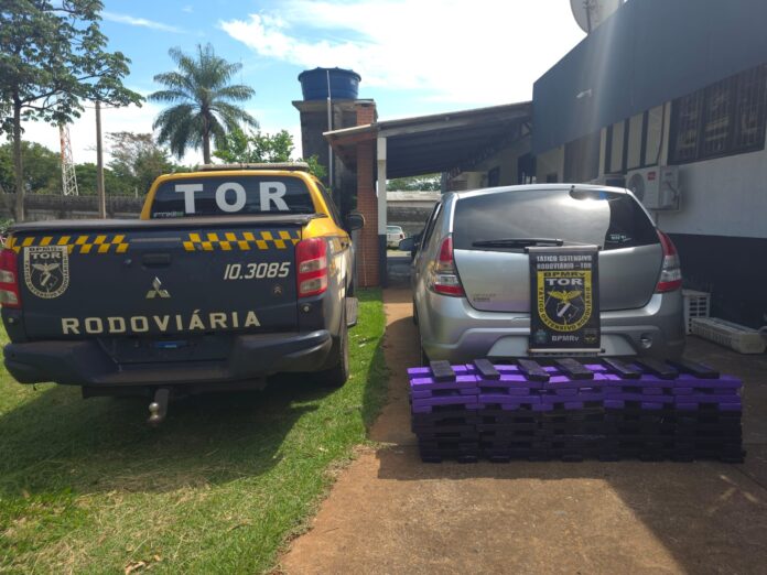 Durante a abordagem a um Renault/Sandero prata, conduzido por um homem de 41 anos, os policiais localizaram diversos tabletes de maconha no porta-malas do veículo, que totalizaram 103,300 kg (cento e três quilos e trezentos gramas) após a pesagem.