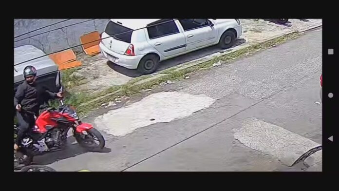 Imagens de câmeras de segurança mostram o momento em que o PM desce da moto e tenta sacar a arma, mas um dos criminosos age mais rápido e atira várias vezes. O vídeo mostra que o policial cai no chão enquanto a dupla foge.
