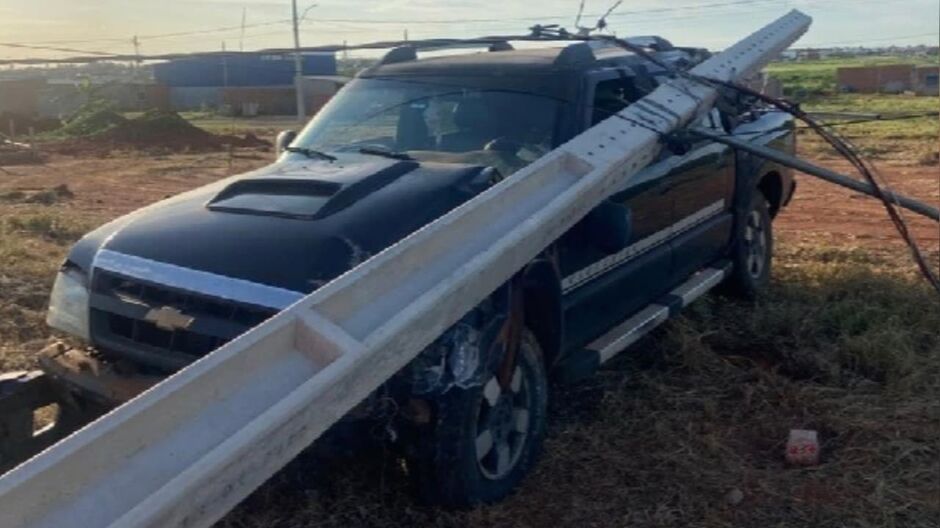 Um poste de iluminação pública caiu sobre uma caminhonete S10 após uma colisão, na madrugada deste sábado (29), no Bairro Green Ville, em Chapadão do Sul.