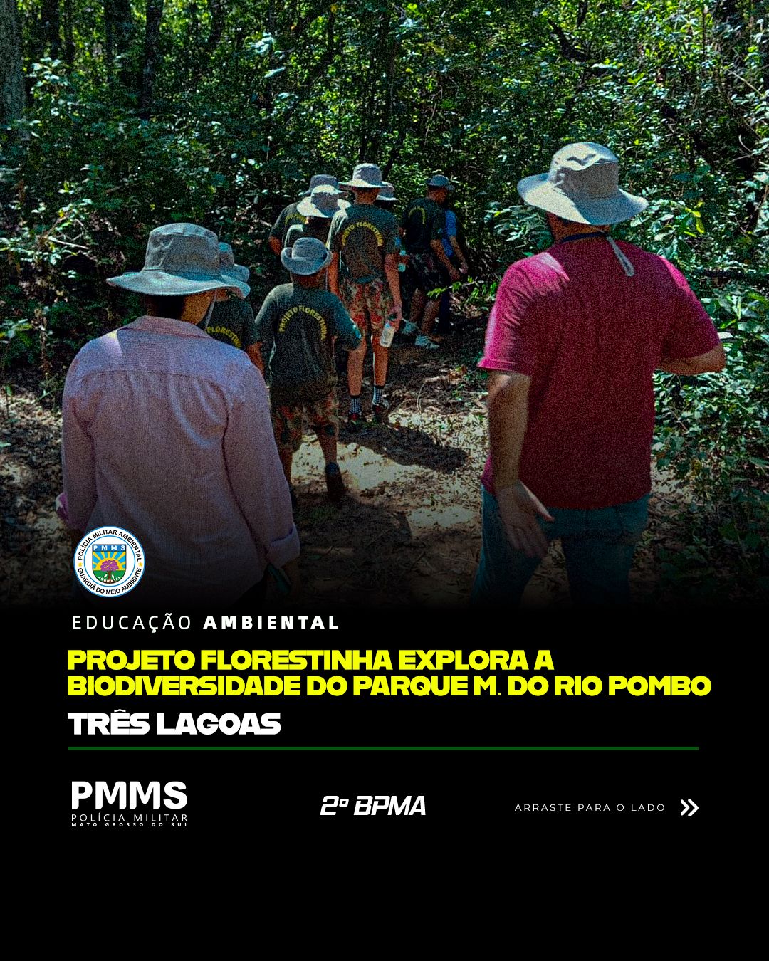 Em uma iniciativa de integração e conscientização, a PMA de Três Lagoas (3ª Cia/2º BPMA) realizou uma ação de educação ambiental no Parque Municipal do Rio Pombo. A atividade foi fruto de uma parceria com as Secretarias Municipais de Meio Ambiente e de Assistência Social, além do apoio do Projeto Tatu Canastra.
