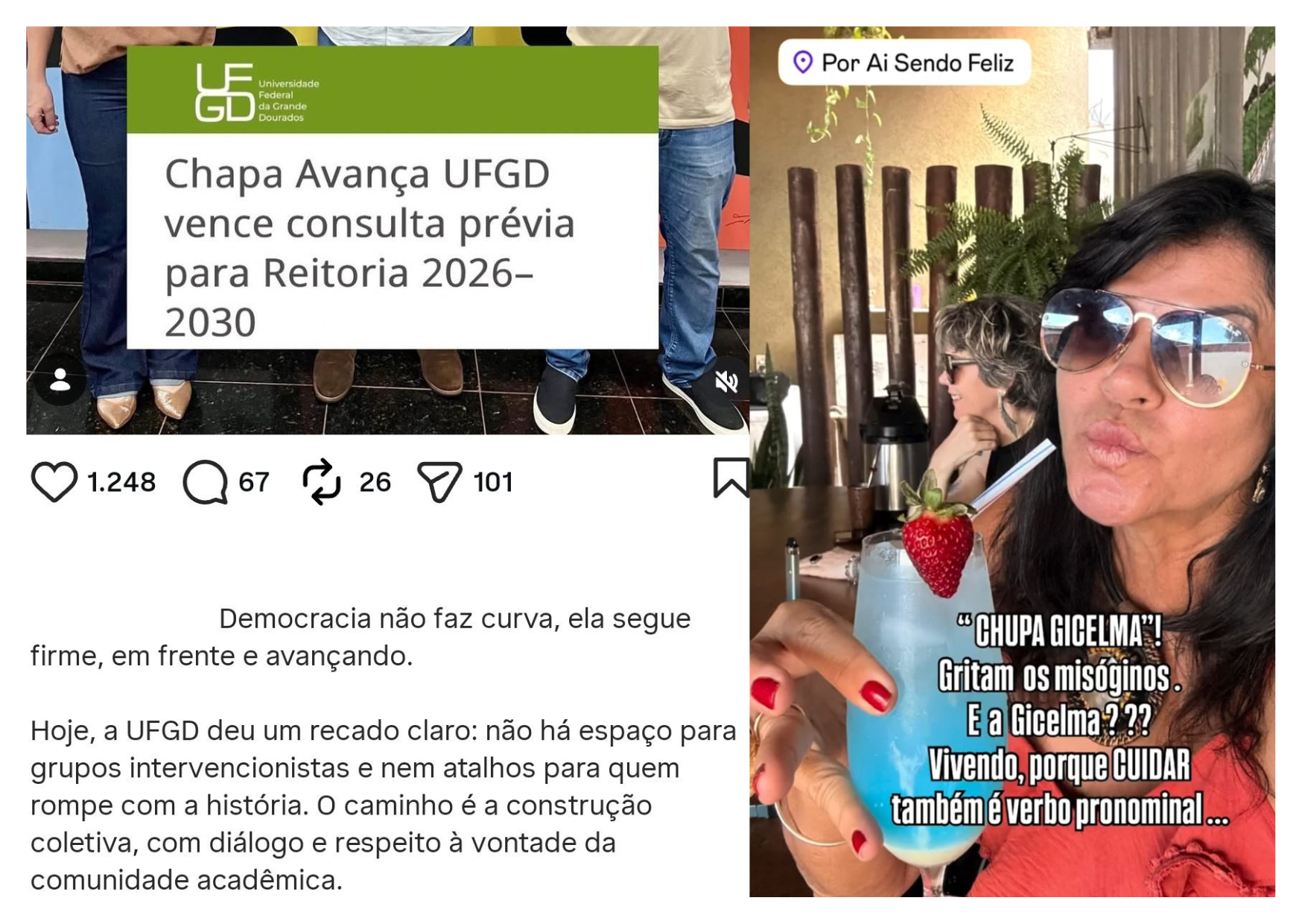 Por fim, a crítica semiótica revela que a frase “chupa, Gicelma” não produz efetivamente um posicionamento político elaborado. Ela funciona sobretudo como performance de vitória e de antagonismo, buscando apoio emocional de um grupo ao deslegitimar uma “ MULHER , e cujo efeito é mais agressivo – performático do que argumentativo. Mas, o pior, é quando tudo isto é feito coletivamente, com a presença do REITOR ( e de mulheres) ! Que lástima , que feio , que triste … Pior ainda , quando publicado e reproduzido por mulheres , e pior ao cubo , por mulheres com cargos públicos … Fica meu lamento! GC