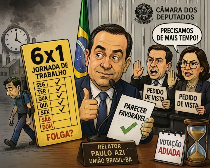 A Comissão de Constituição e Justiça da Câmara dos Deputados adiou a votação da PEC que trata da jornada de trabalho no modelo 6×1, apesar do parecer favorável do relator Paulo Azi. O adiamento ocorreu após pedido de vista apresentado por parlamentares da oposição, o que suspende a análise da proposta por até duas sessões.