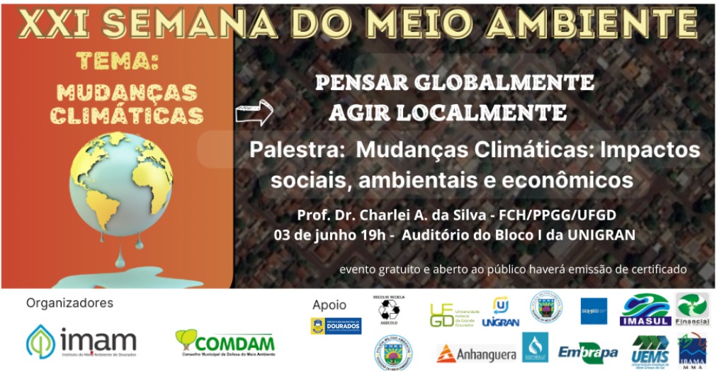 Em celebração ao Dia Nacional do Meio Ambiente, em 5 de junho, o Conselho Municipal de Defesa do Meio Ambiente (Comdam) e o Instituto Municipal de Meio Ambiente de Dourados (IMAM) realizam, juntos, de segunda (3) a sexta-feira (7), a XXI Semana do Meio Ambiente com o tema “Mudanças Climáticas: pensar globalmente, agir localmente.
