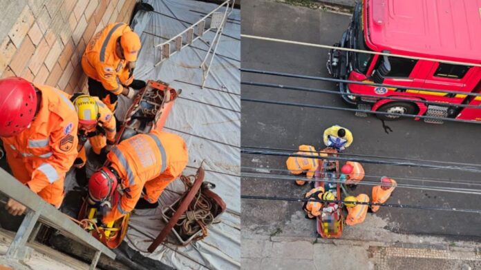 Como o homem estava em altura e em local de difícil acesso, foi necessário o emprego de técnicas de salvamento em altura para realizar a retirada segura da vítima, utilizando uma maca do tipo Sked até o pavimento inferior.