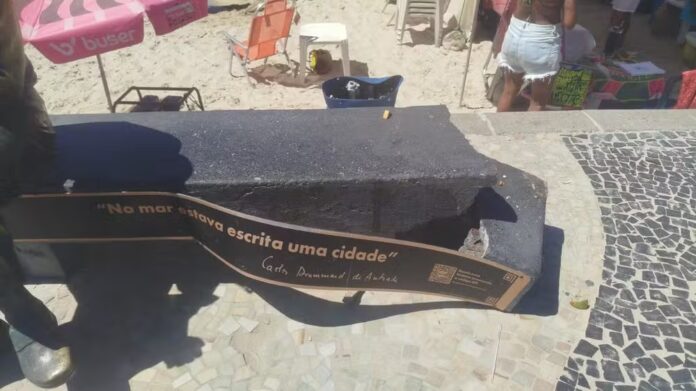 O banco onde está instalada a estátua em homenagem ao poeta Carlos Drummond de Andrade, foi danificado por um turista que tentou quebrar um coco no local na última sexta-feira (27). A informação foi confirmada pela Secretaria Municipal de Conservação.